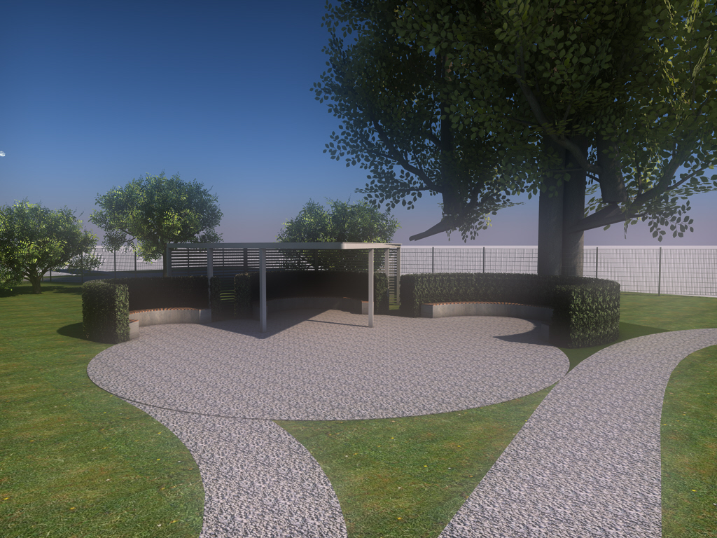 Das Grüne Klassenzimmer entsteht auf einem sanft aufgeschütteten Hügel, der stufenweise ansteigt und Raum für eine vielseitige Nutzung schafft. Der Aufbau erinnert an ein kleines Amphitheater und eignet sich ideal für Unterricht im Freien, Vorträge sowie kleine Theater- und Musikveranstaltungen.